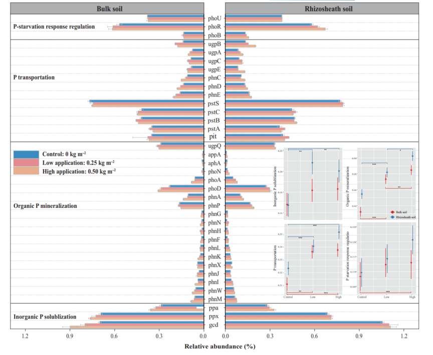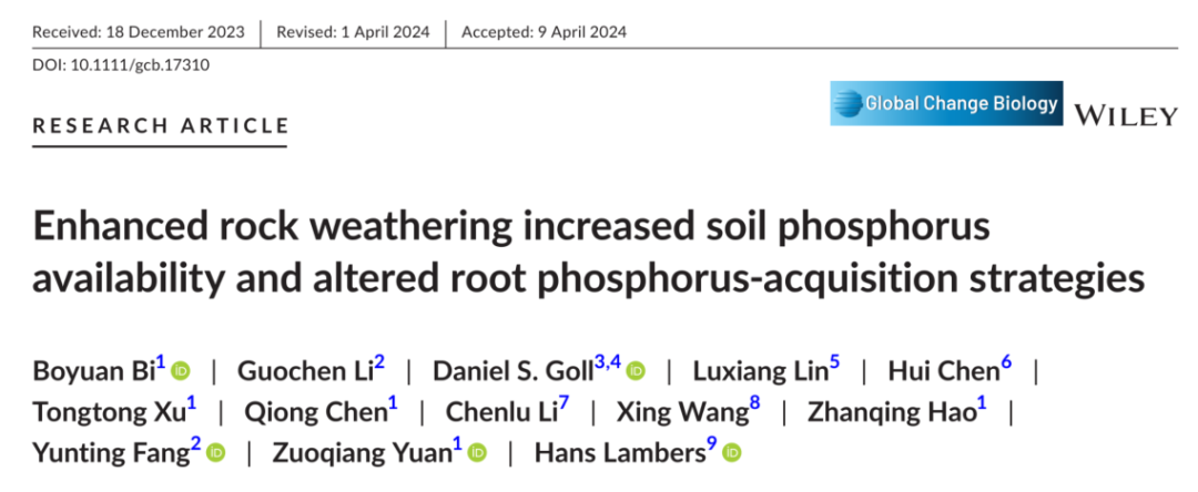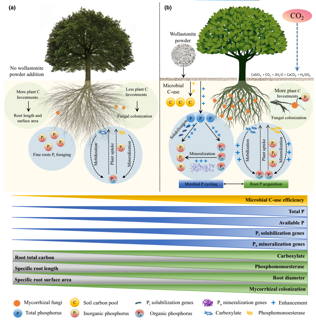 增强岩石风化(ERW)被认为是提高土壤固碳潜力和肥力的一种措施。增强岩石风化对土壤磷库的影响以及影响微生物磷循环和植物磷吸收的机制尚不清楚。通过在热带橡胶林2年的硅灰石田间添加试验,探讨了ERW对土壤磷有效性、微生物磷循环官能团和根系磷获取性状的影响。结果表明,ERW通过促进根际羧酸盐和磷酸酶活化和矿化有机磷,显著提高了土壤微生物的碳利用效率和全磷含量,并间接提高了土壤磷有效性。此外,ERW还刺激了磷增溶酶(gcd、ppa和ppx)和矿化酶(phoADN和phnAPHLFXIM)的活性,从而促进了无机磷的增溶和有机磷的矿化。随着土壤磷有效性的提高,橡胶细根的磷获取策略由根自身获取向依赖菌根协同作用和根系分泌物释放转变。此外,ERW对根系磷获取性状(如根径、比根长和菌根定植率)的直接影响也可能与植物地下碳投入模式的变化有关。综上,ERW增加了热带森林的固碳潜力和磷有效性,并显著影响了地下植物资源利用策略。