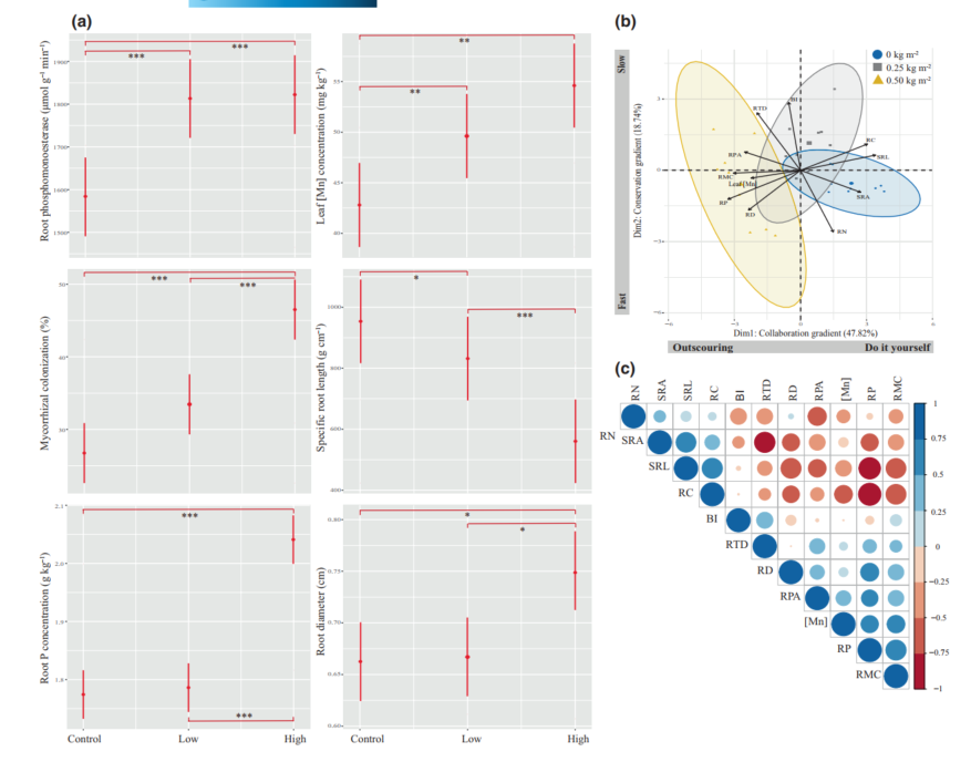 植物根系对磷的吸收和根系获取策略通常通过根系P获取特性来表征。这些性状通常包括菌根定植率、比根长(SRL)、根径(RD)和根际磷酸酶和羧酸盐。除了菌根真菌的细根和菌丝对无机磷的积极吸收外,根分泌的羧酸盐和磷酸酶对有机磷的动员和矿化是植物获取磷的最有效途径。事实上,在极低的磷有效性下,丛枝菌根共生通常受到抑制。目前,ERW对植物根系P-获取策略的潜在影响尚不清楚。