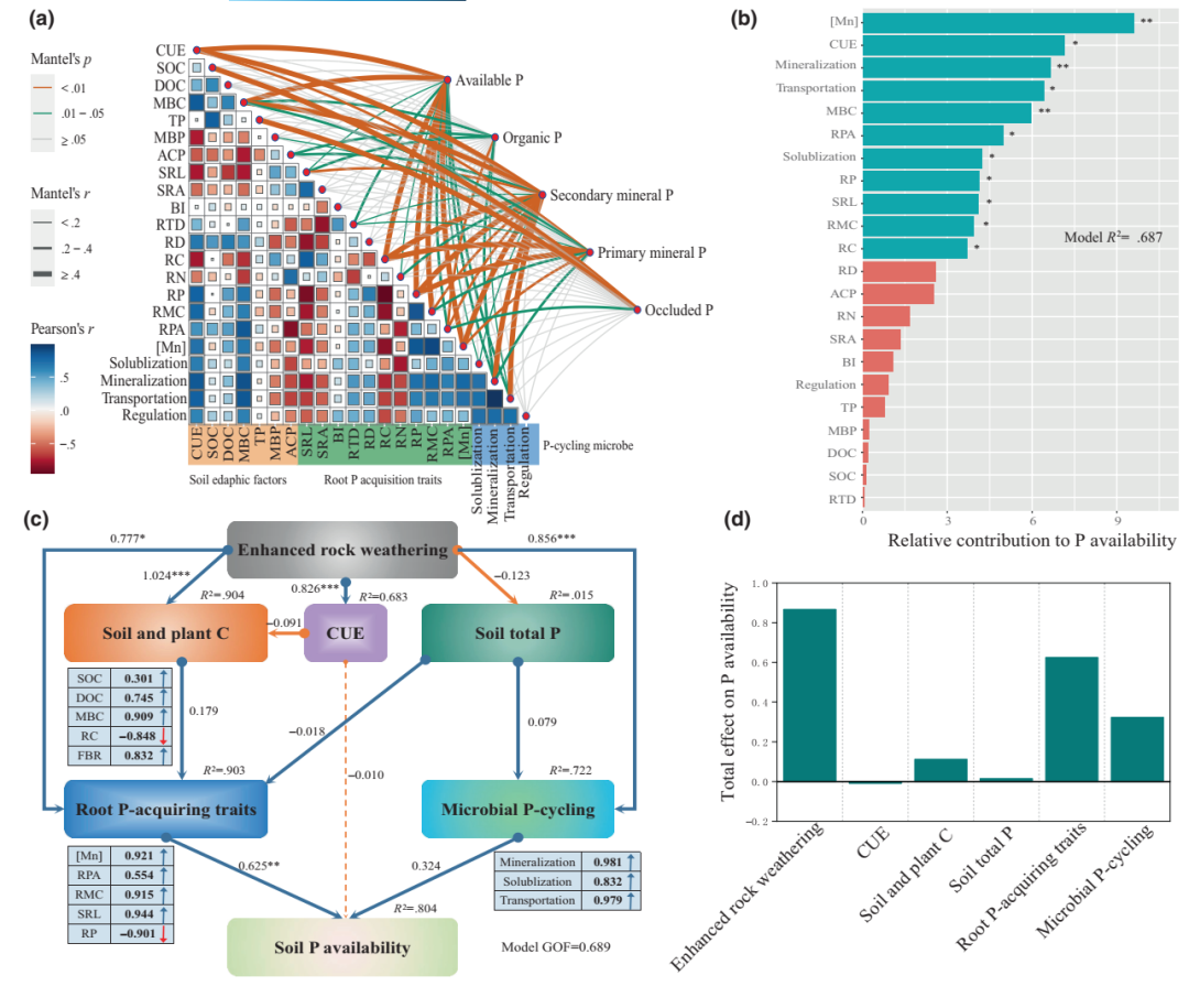 除土壤闭蓄态磷外,其余4个磷组分均与根系磷获取性状、磷循环功能基因和微生物CUE有很强的相关性(图5)。例如,有效磷和磷获取性状(如RP、RPA、[Mn]和RMC)与微生物磷循环功能群(如参与磷溶解、磷矿化和磷运输的基因)之间存在很强的相关性。同时,预测模型(解释了68.7%的变化)表明,上述因素也是影响磷可用性的最重要驱动因素。此外,PLS-PM分析显示,ERW主要通过影响根系磷获取特性和微生物磷循环间接增加土壤磷有效性。然而,在该模型中,微生物CUE的作用减弱了。这些结果表明,ERW通过促进根系分泌物(羧酸盐和磷酸单酯酶)的释放、根系性状(菌根定植和SRL)之间的协同作用以及微生物P循环(Pi增溶和Po矿化过程)提高了土壤P的有效性。