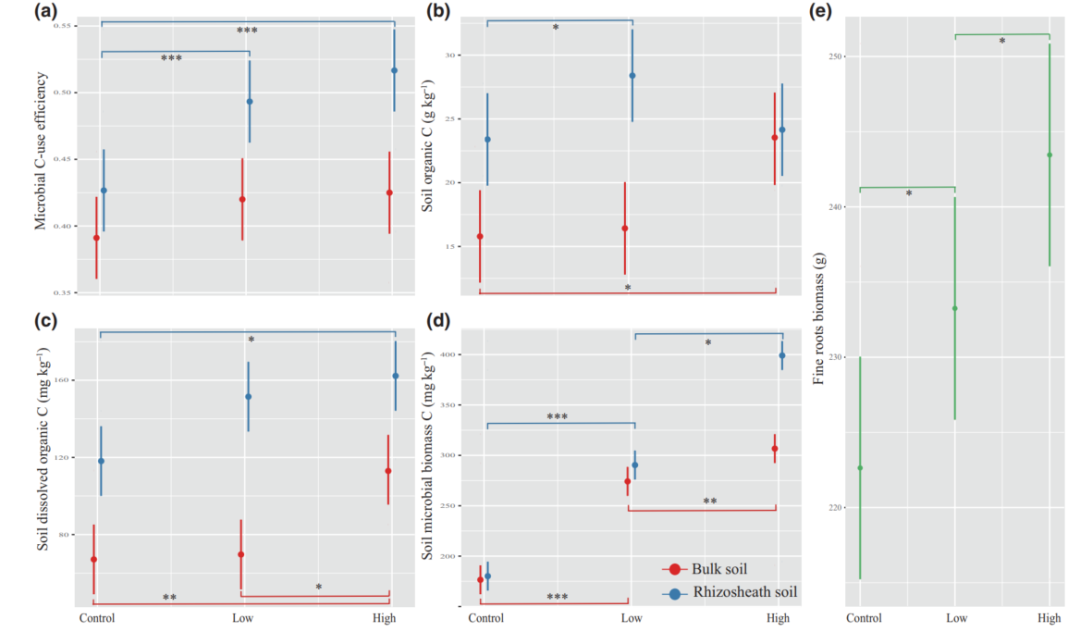 与对照相比,硅灰石增加了有机碳浓度,低施量对根际有机碳的影响显著,高施量对根际有机碳的影响显著(图1)。高硅灰石处理的根际和非根际土壤溶解有机碳和微生物生物量C浓度均高于对照,其中微生物生物量C浓度比对照提高了至少80%。此外,添加硅灰石显著增加了根际土壤微生物CUE,添加硅灰石的细根生物量显著大于对照。