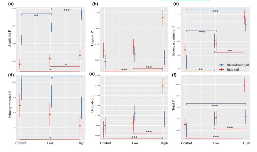 图2 线性混合效应模型比较了不同硅灰石施用量对根际和非根际土壤磷含量(mg kg−1)的影响。